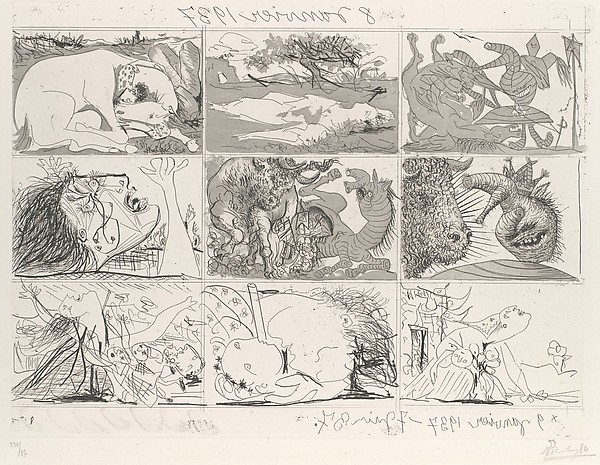 5月1日、これに抗議する史上最大といわれるメーデーのデモが行われた。この日は日曜日だった。いつもなら、田舎の別荘で週末を過ごすピカソ。しかし、彼はこの日、田舎へは行かなかった。そのかわりに、一束の青い用紙をとりだし、そこに走り書きのような馬、牡牛、女の形をデッサンした。