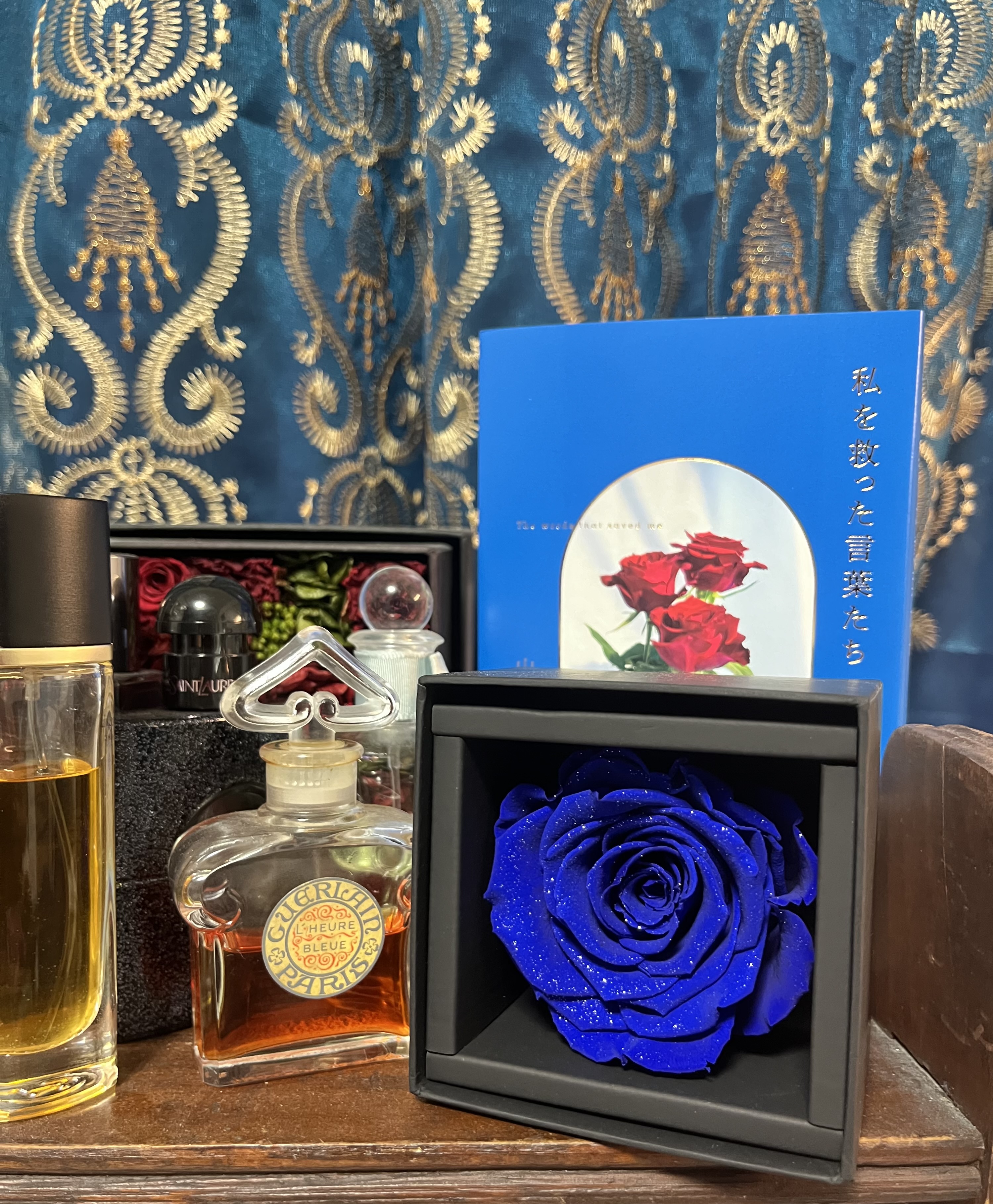 写真はイベントのときに手紙とともにプレゼントしてくれたブルーローズ。本の装丁と絶妙な組み合わせ。嬉しかった。