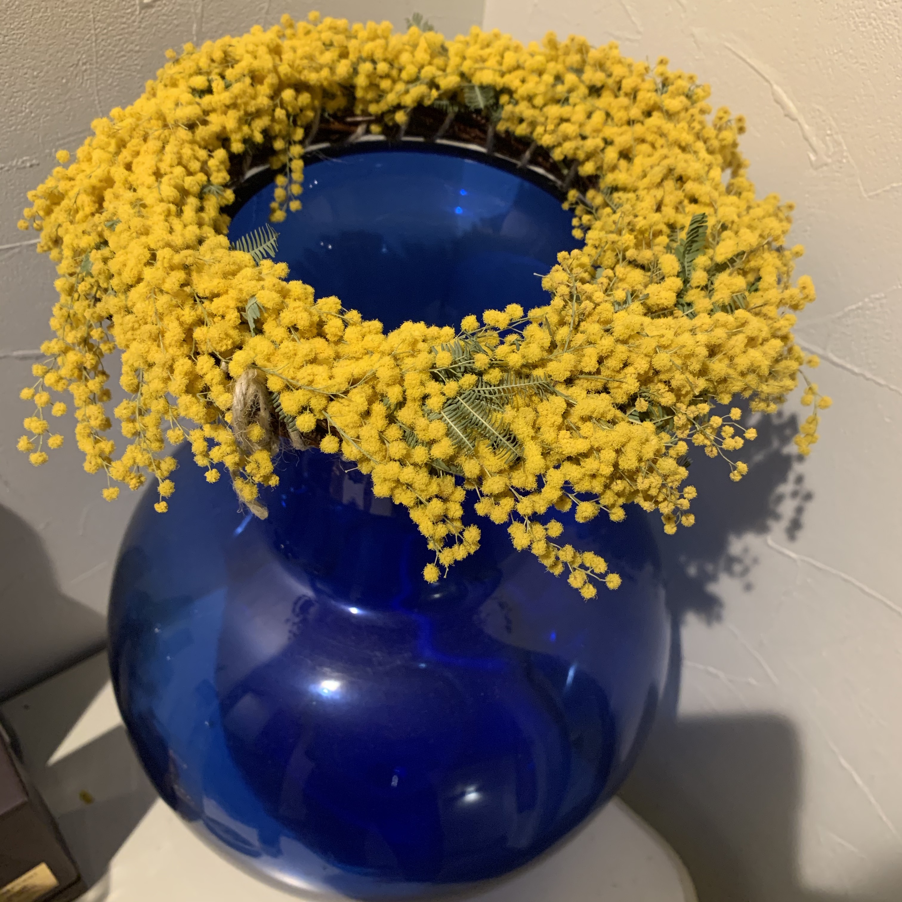 *写真は土曜日の路子サロンのとき、内田容子さんからいただいた、ミモザのリース。壁掛け用なのだけど、ブルーと黄色が綺麗! なのでここに飾っています。手づくりよ。すごいわ。